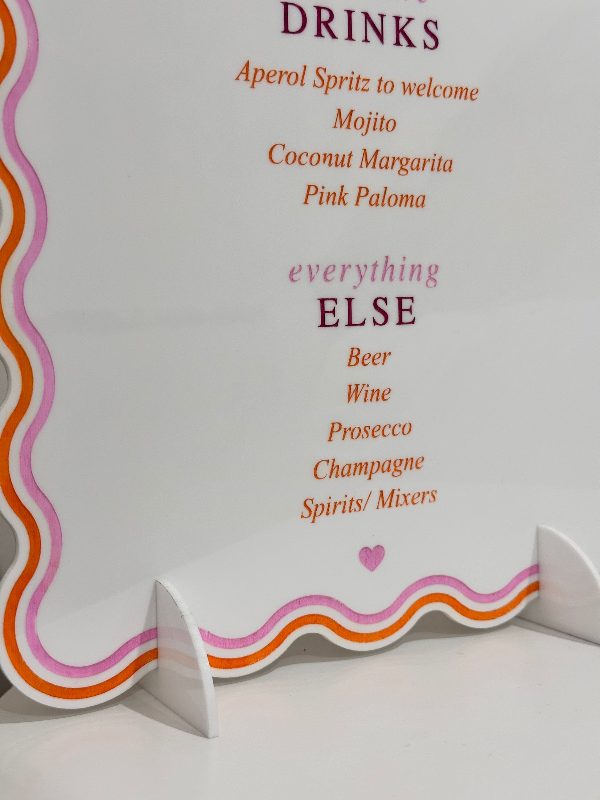 Our custom bar signs/ drinks menus will stand out and come in a variety of colours to suit your wedding table decor.