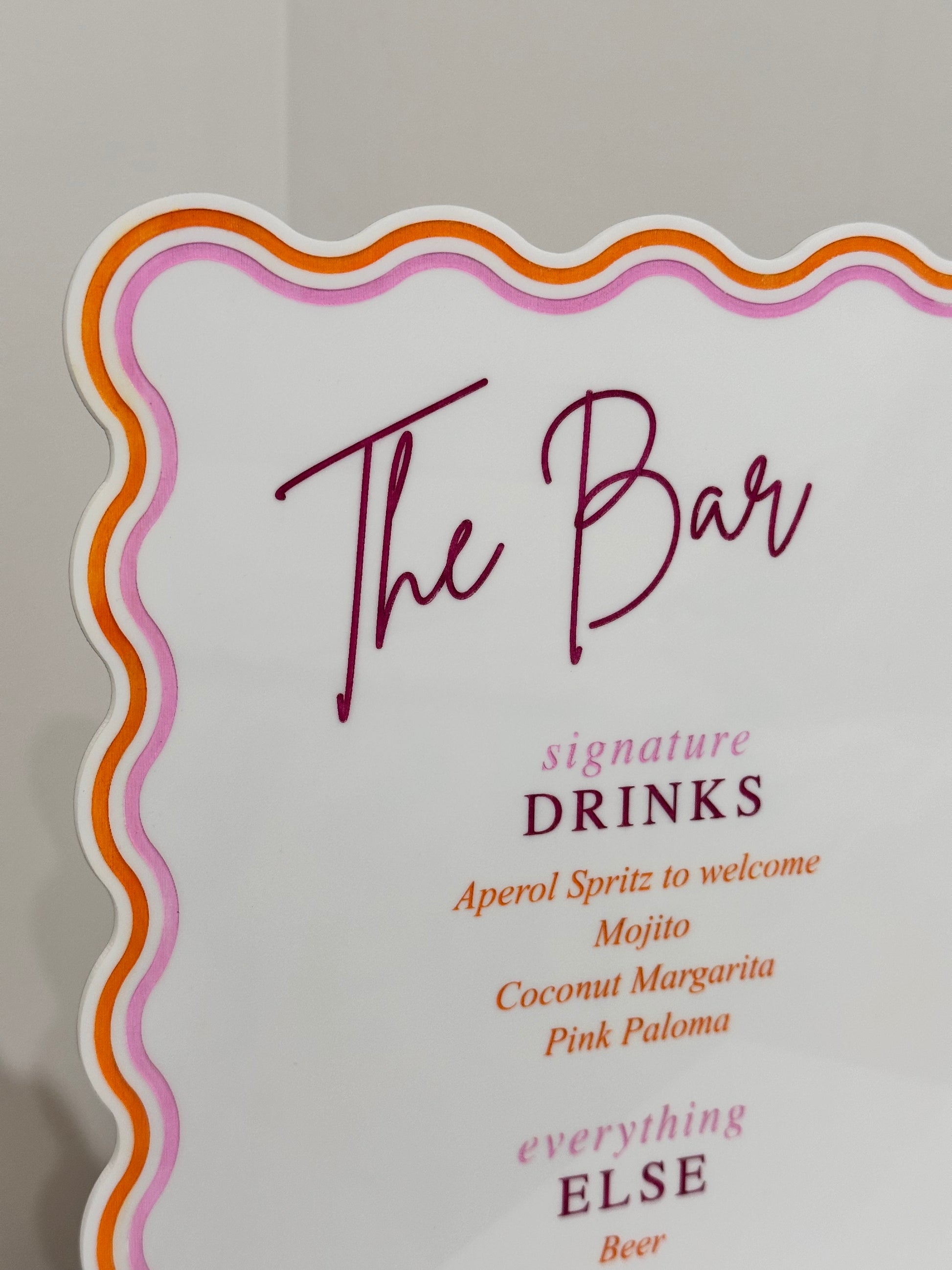 The heading is made from 3mm acrylic and adhered to your bar menu. The rest of the lettering is laser engraved onto 3mm acrylic to ensure no letters are missing/peeling off before your event.