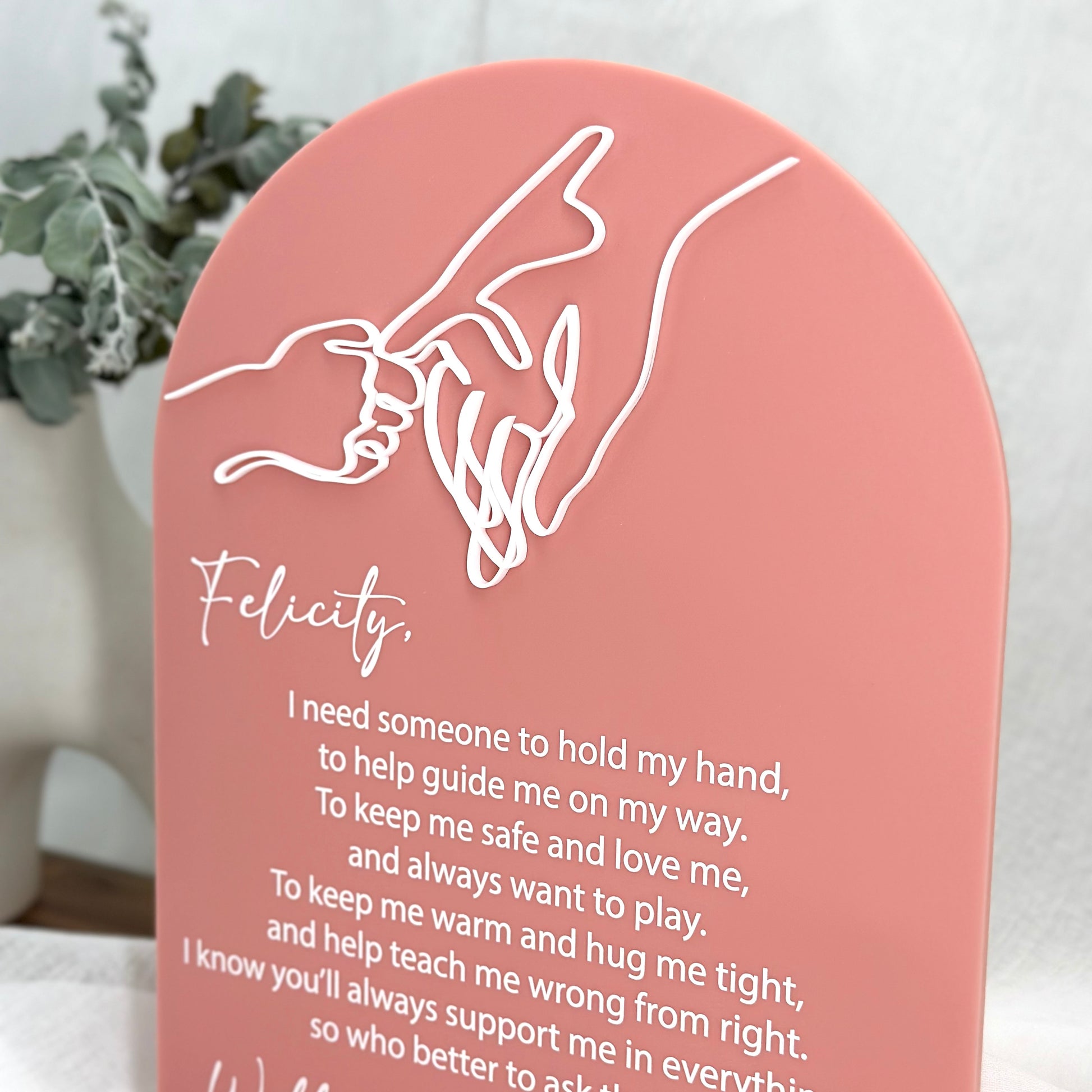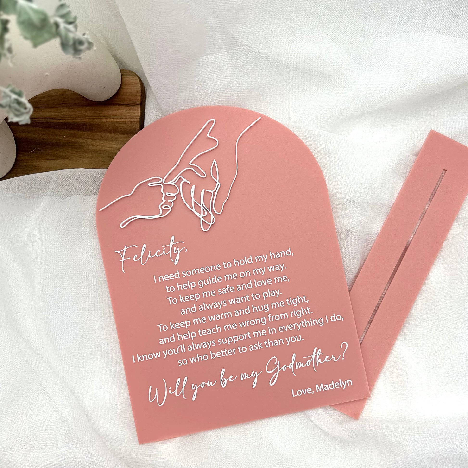 Our godparent proposal plaque offers a heartfelt and meaningful way to invite someone special to be your child’s Godfather or Godmother. Crafted from high-quality 3mm acrylic, it features your choice of backing color, custom UV printed text and a 3D acrylic hand design as pictured.